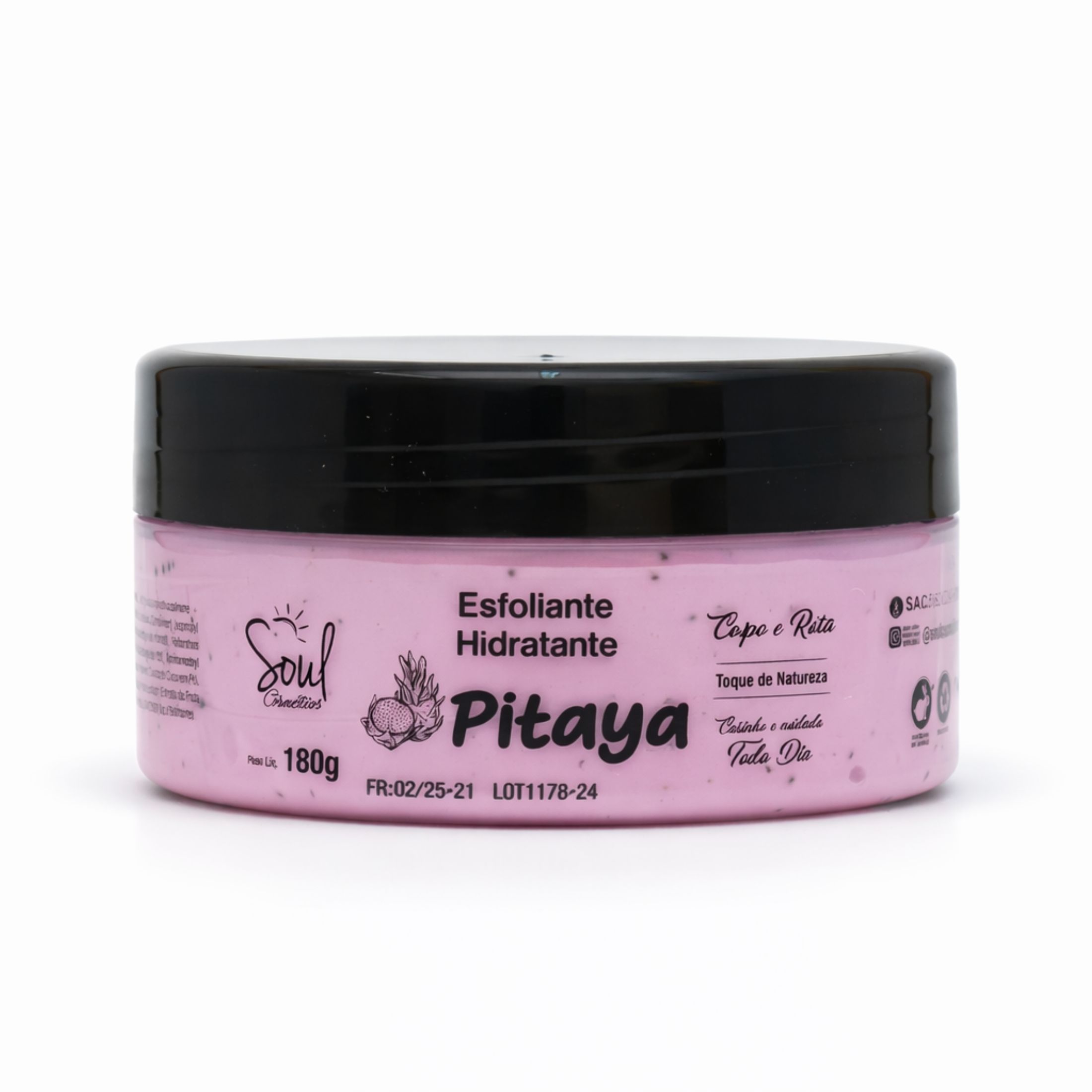 Hidratante esfoliante pitaya 180g Soul cosméticos formulado com extrato de pitaya, conhecido por suas propriedades antioxidantes e nutritivas, este esfoliante proporciona uma experiência de spa em casa. Suas microesferas esfoliantes removem gentilmente as células mortas e impurezas da pele, promovendo a renovação celular e deixando a pele mais lisa e uniforme. Além disso, sua fórmula cremosa desliza facilmente sobre a pele, proporcionando uma aplicação suave e confortável.