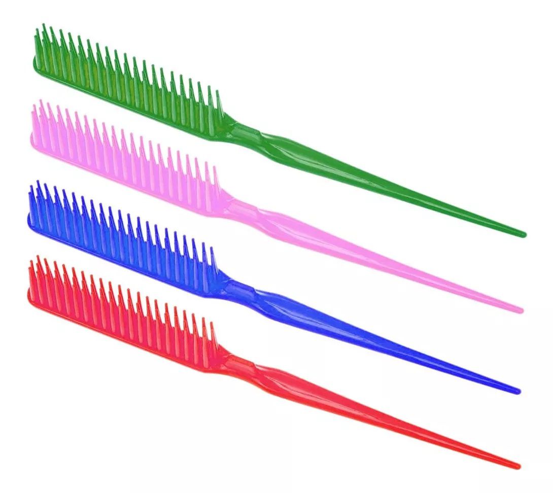 Escova em plástico com o formato retangular, diversas cores, penteia o cabelo e massageia o couro cabeludo, o cabo fino auxilia na separação de mechas para aplicação de tinturas e penteados. Pode ser usada no cabelo molhado ou seco.