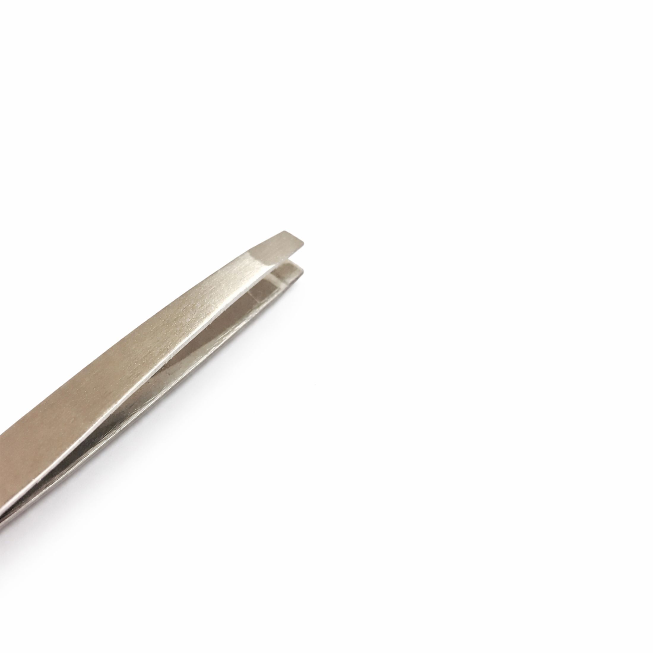 A ponta é reta e levemente inclinada, projetada para permitir maior precisão ao segurar objetos pequenos ou pelos.