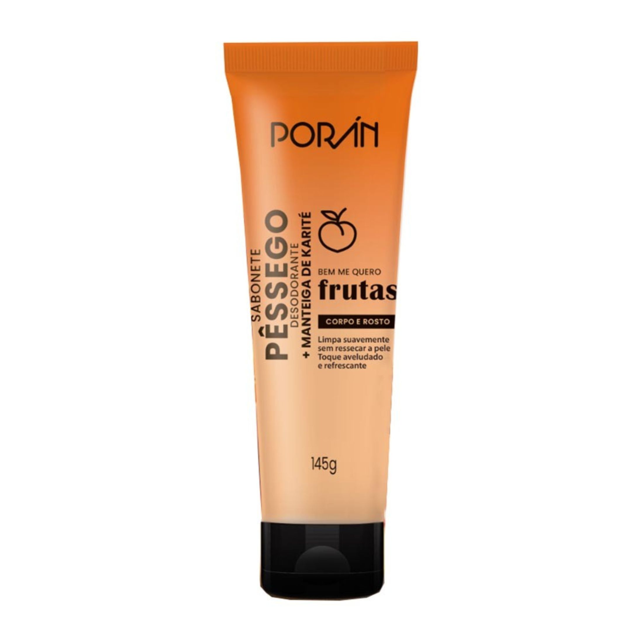 Modo de uso: Aplique o Sabonete Corpo e Rosto Pêssego + Manteiga de Karité - Poran sobre a pele úmida, massageando suavemente até formar espuma. Enxágue em seguida com água abundante.