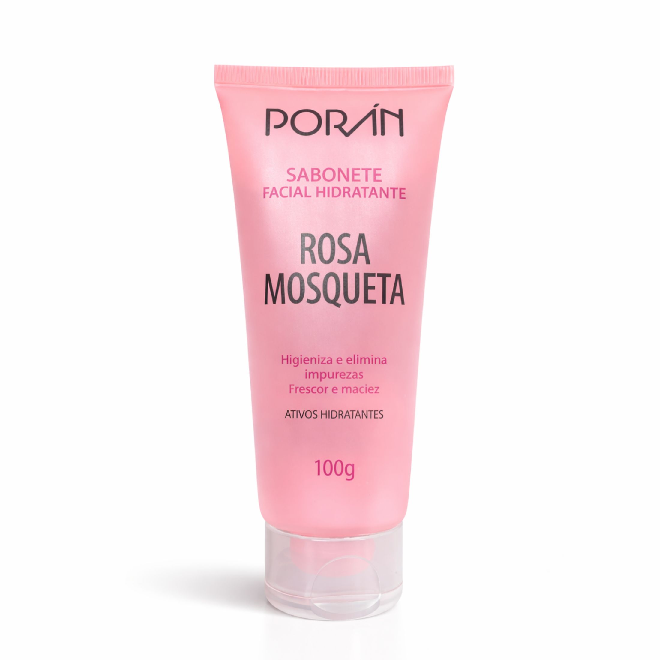 Sabonete facial Rosa Mosqueta Porán higieniza o rosto sem remover a proteção natural, elimina impurezas oferecendo frescor e maciez, possui poderosos ativos hidratantes que atuam no momento da limpeza.